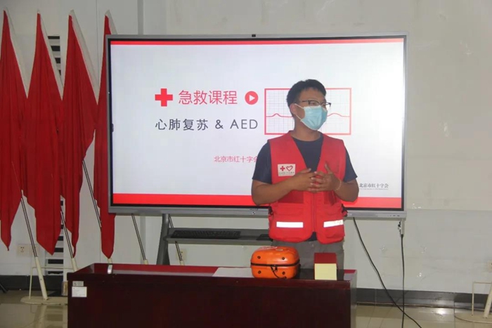 培训现场,红十字会讲师讲解了意外情况下的心肺急救知识,并利用模拟假人详细讲解了心肺复苏术和自动体外除颤器(AED)的操作要领。